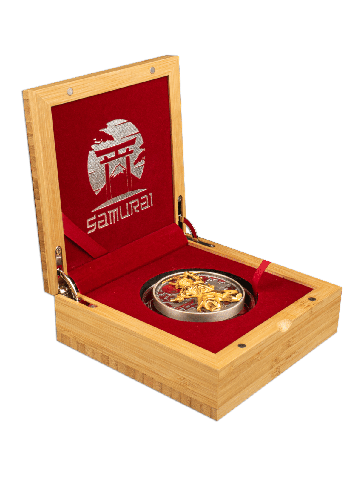 SAMURAI 5 Oz Silver coin is dedicated to the Samurai, the historical warrior in feudal Japan, skilled in combat with weapons such as swords, expected to adhere to a strict code of honor known as Bushido. The coin has an Antique Finish quality, a wonderful High Relief and a selective Gold plating! The coin comes in a luxury case, along with the Certificate of Authenticity. Limited mintage of only 399 pieces worldwide!