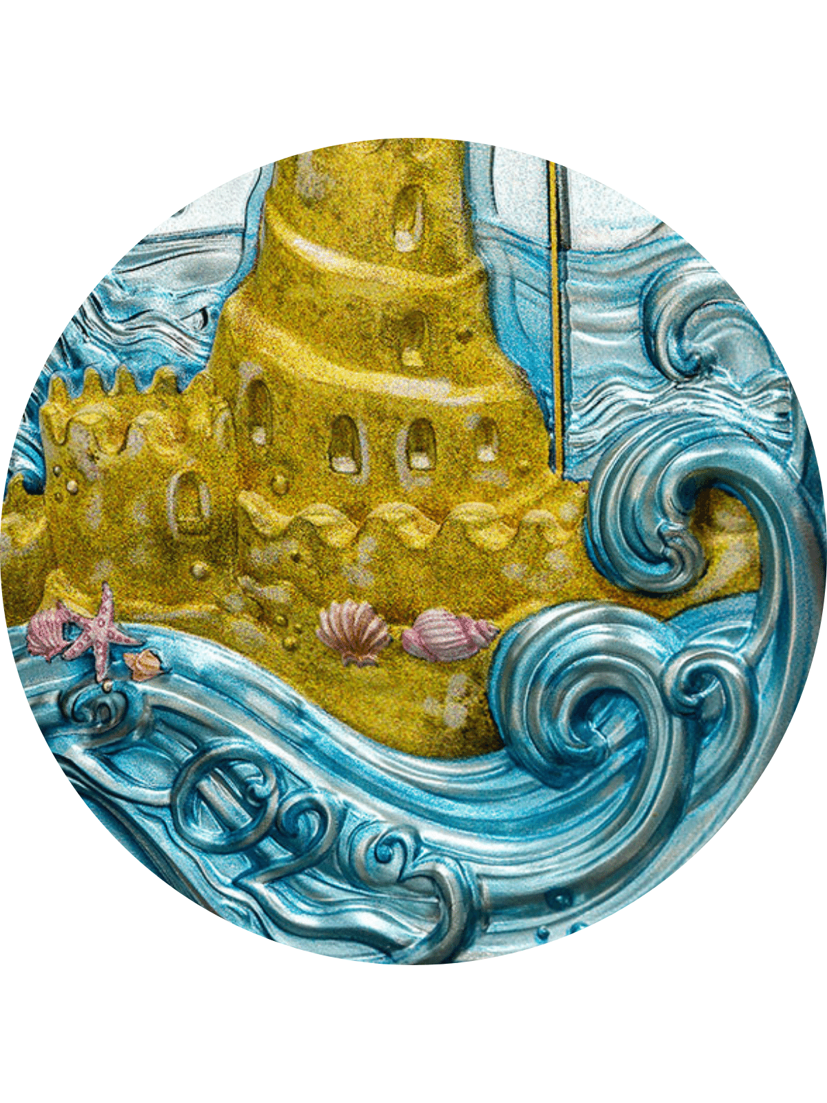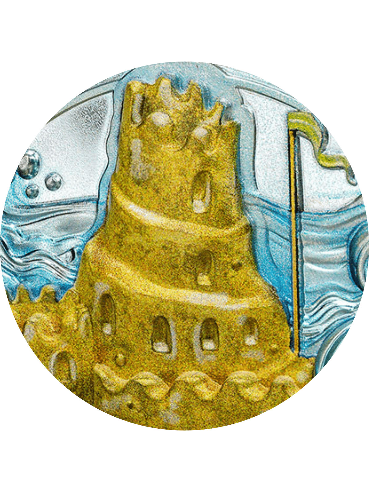 SANDCASTLE 3 Oz Silver coin is the first issue of the new "Childhood Memories" series and is dedicated to the deepest and most beautiful memories of our childhood, in this edition: Sandcastle. The coin features the Smartminting technology, has an amazing design with a lovely coloration and an incredible High Relief. The coin comes in an elegant frame case, along with the Certificate of Authenticity. Limited mintage of 499 pieces worldwide!