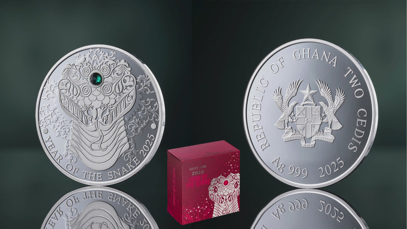Explore the 'SNAKE Lunar Year 1/2 Oz Silver Coin,' featuring a stylized snake with a green crystal, accompanied by the Public Seal of Ghana on the obverse