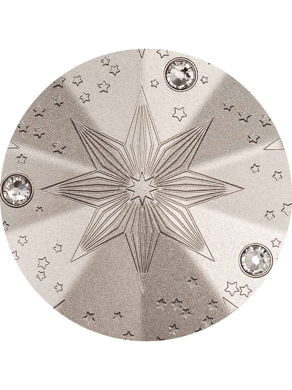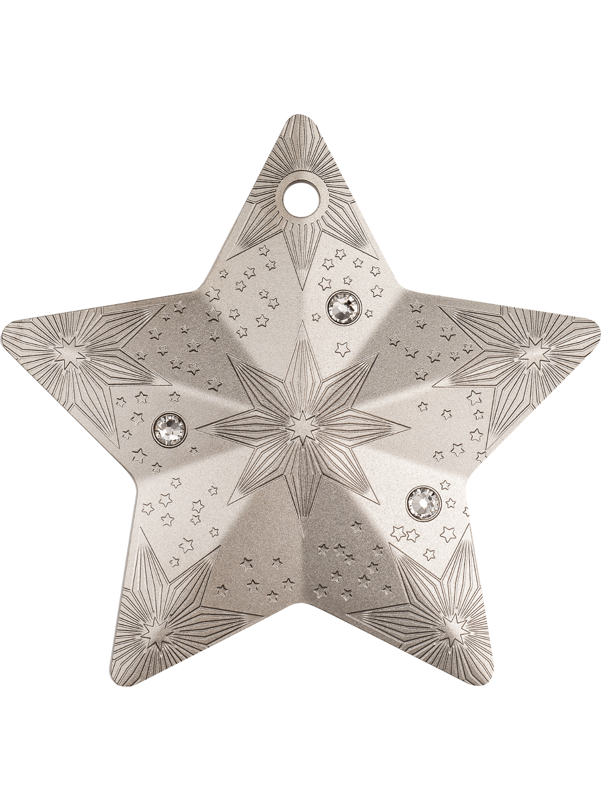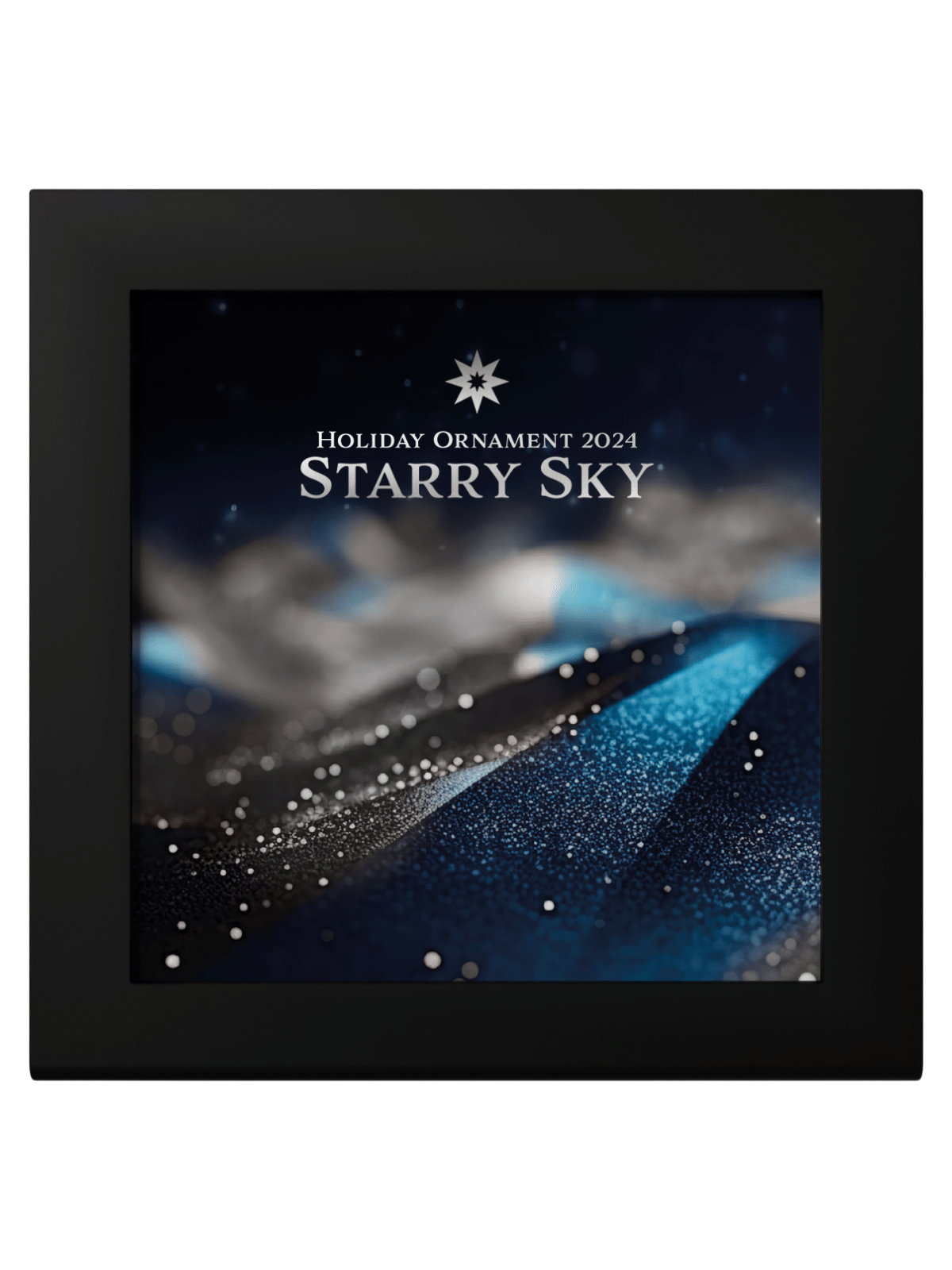 STARRY SKY Holiday Ornament 1 Oz Silver Coin is shaped and features a beautiful and charming pendant, perfect for your Christmas trees! The coin has a Silk Finish quality, features a beautiful design and comes in a case, along with the Certificate of Authenticity. Limited mintage of 2024 pieces worldwide.