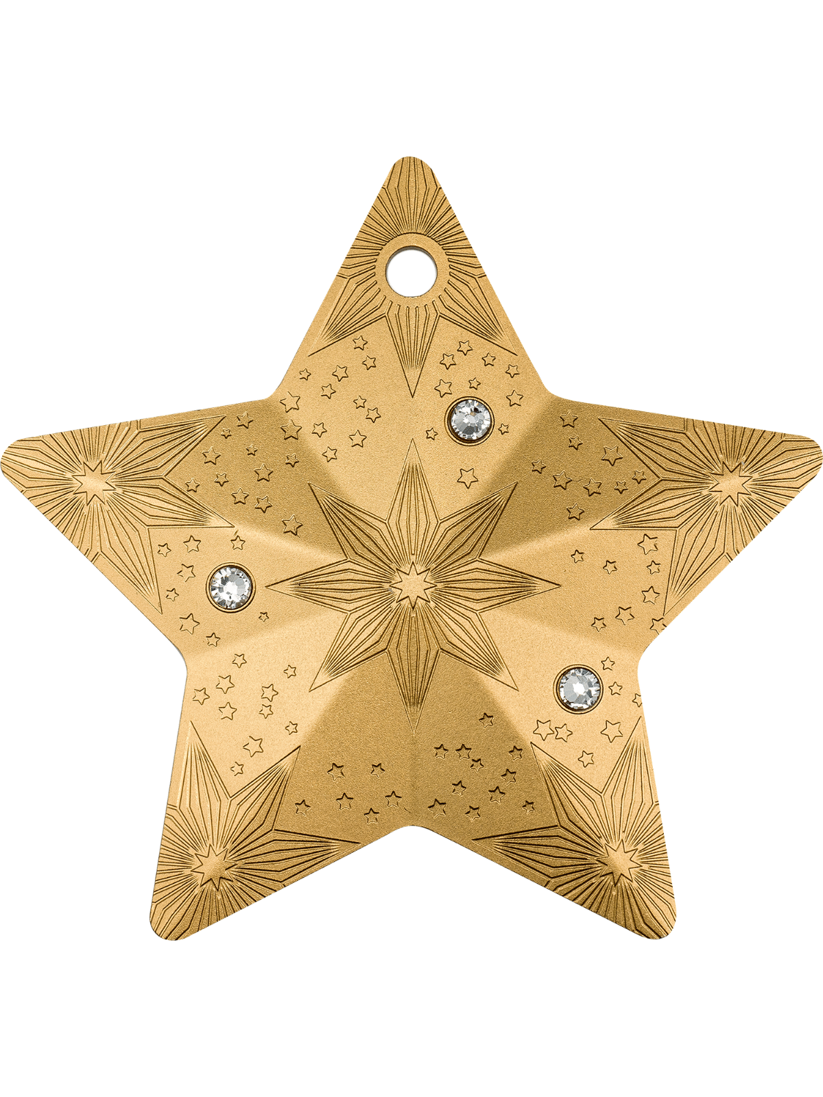 STARRY SKY Holiday Ornament Gilded 1 Oz Silver Coin is shaped and features a beautiful and charming pendant, perfect for your Christmas trees! The coin has a Silk Finish quality, has a Gold plating, features a beautiful design and comes in a case, along with the Certificate of Authenticity. Limited mintage of 750 pieces worldwide.