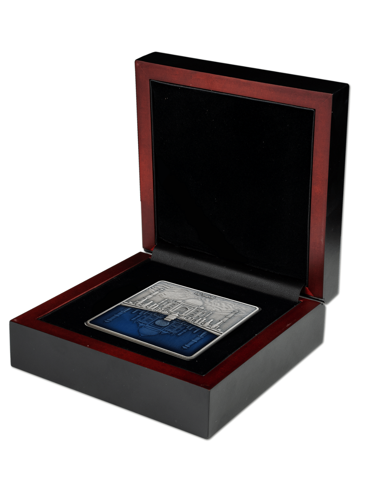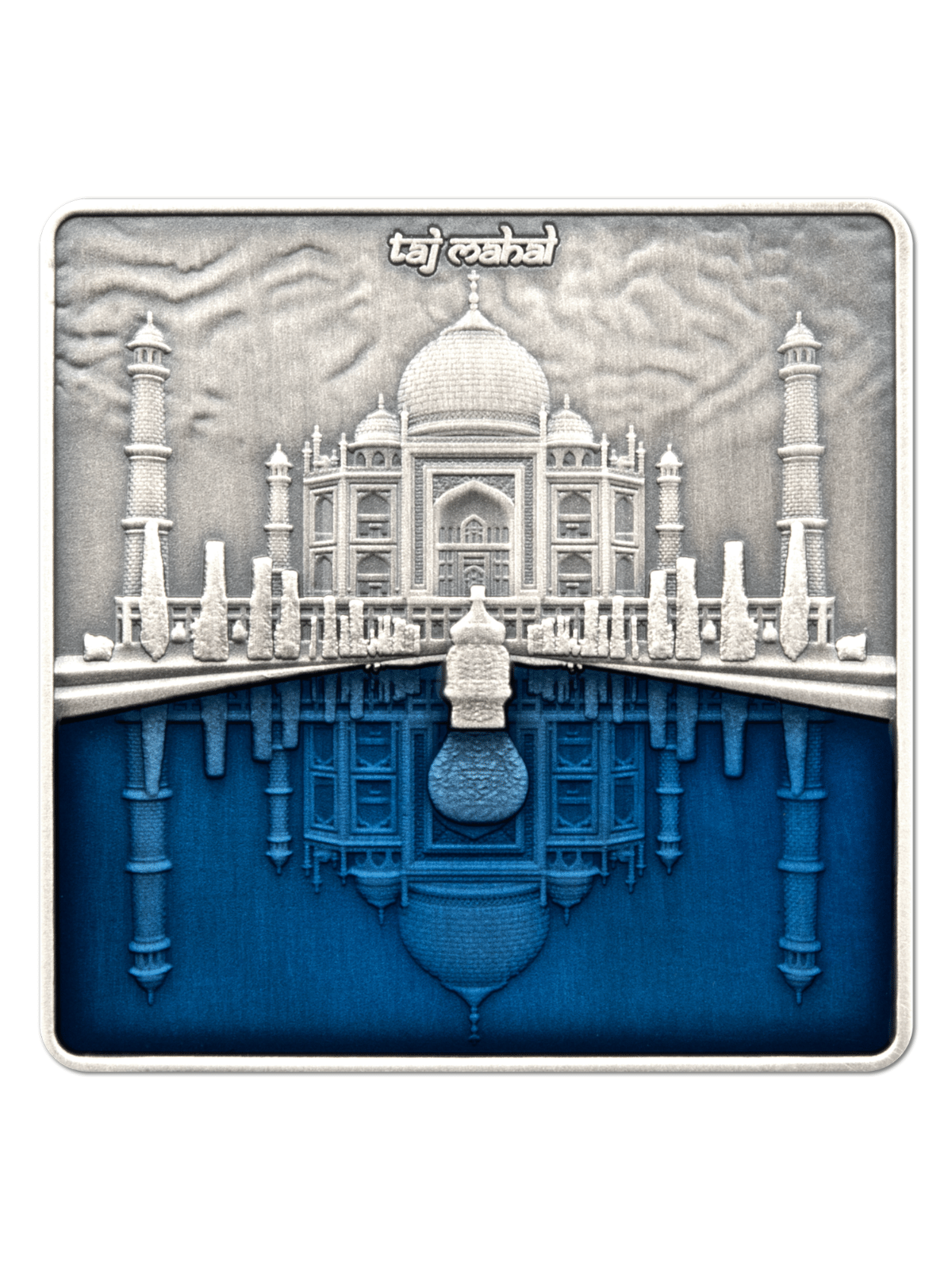 TAJ MAHAL 3 Oz Silver coin is dedicated to the famous UNESCO world heritage, the India’s iconic landmark: the Taj Mahal. The coin has a wonderful square shape, an Antique Finish quality, has an enamel application and comes in a case, along with the Certificate of Authenticity. Limited mintage to only 1648 pieces worldwide!