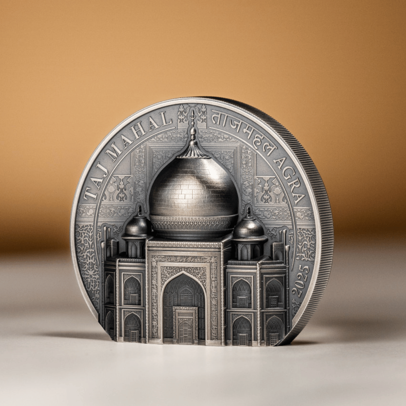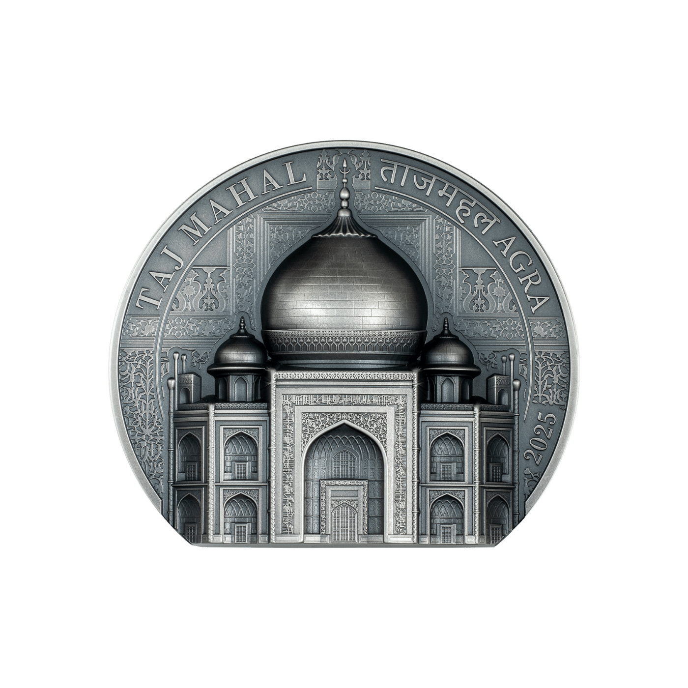 Completed in 1648, the Taj Mahal in Agra, India, was built by Shah Jahan in memory of his wife Mumtaz Mahal. Its iconic white marble dome, intricate minarets, and gemstone inlays attract millions of visitors annually. This freestanding coin, the 4th in the series, features ultra-high relief and antique finish, showcasing the Taj Mahal‘s architectural brilliance and interior views of the tomb. A numismatic masterpiece celebrating eternal love.