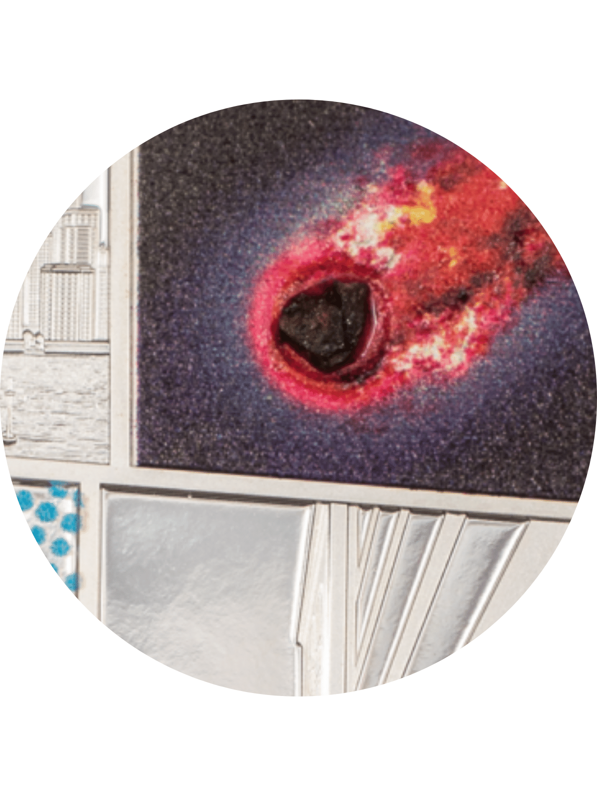 TENHAM 1 Oz Silver coin is part of the "Meteorite Impacts" series and features the meteorite event unfolded in the skies above Tenham Station, in the Australian outback. Witnesses reported seeing a bright fireball streaking across the sky before hearing a loud boom. The coin in Proof quality has High Reliefs in Smartminting technology and an authentic Meteorite insert. The coin comes in a case, along with the Certificate of Authenticity. Limited mintage of 2500 pieces worldwide!