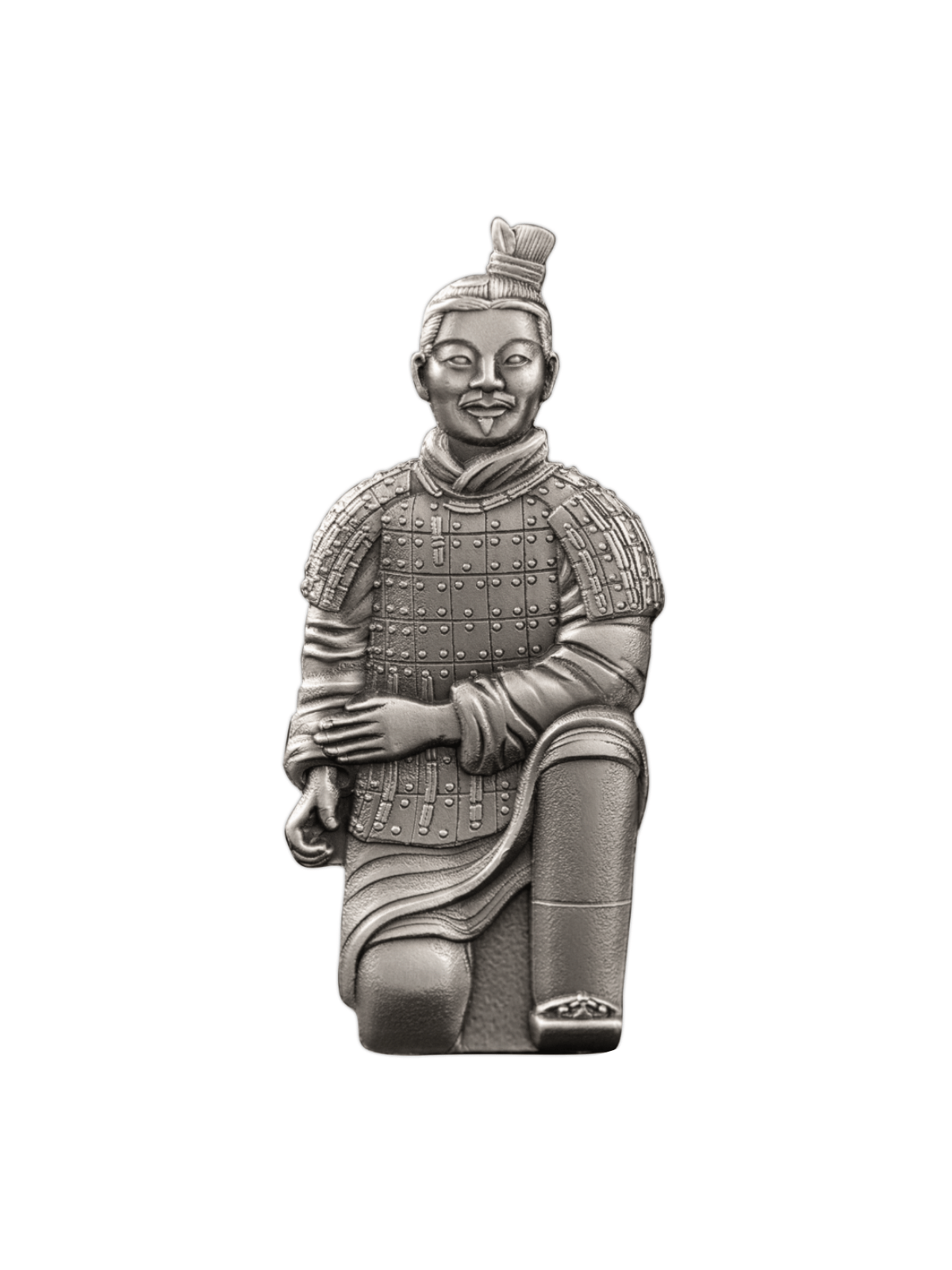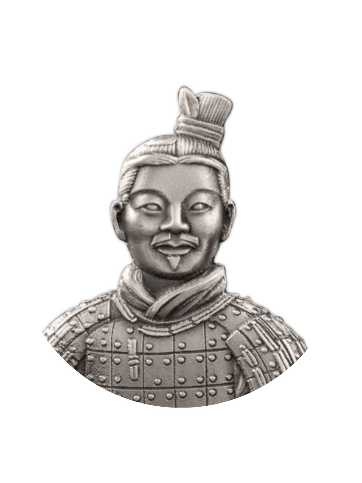 TERRACOTTA ARMY DISCOVERY 2 Oz Silver coin depicts a Chinese warrior, for celebrating the 50th Anniversary of the discovery of the Terracotta Army. The coin in Antique Finish quality, is shaped and has High Reliefs. It comes in a case, along with the Certificate of Authenticity. Limited mintage of only 500 pieces in the world!