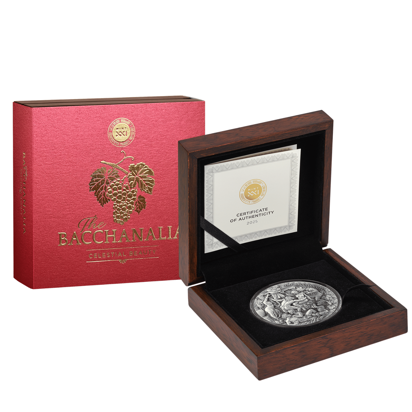 The new premium collectible from MINT XXI’s iconic Celestial Beauty collection captures a stunning Bacchanalian revelry scene inspired by Paul Gustave Doré’s art. With its high relief and intricate details, this 5-ounce coin transports you to a world of divine indulgence and earthly pleasures. Limited to only 333 pieces worldwide, this 65 mm silver canvas portrays highly detailed figures celebrating Bacchus, the god of the vine, showcasing an enduring delight in freedom and light-heartedness. Its Baroque motifs enhance its timeless appeal, with each detail meticulously crafted to convey the allure of unrestrained joy.