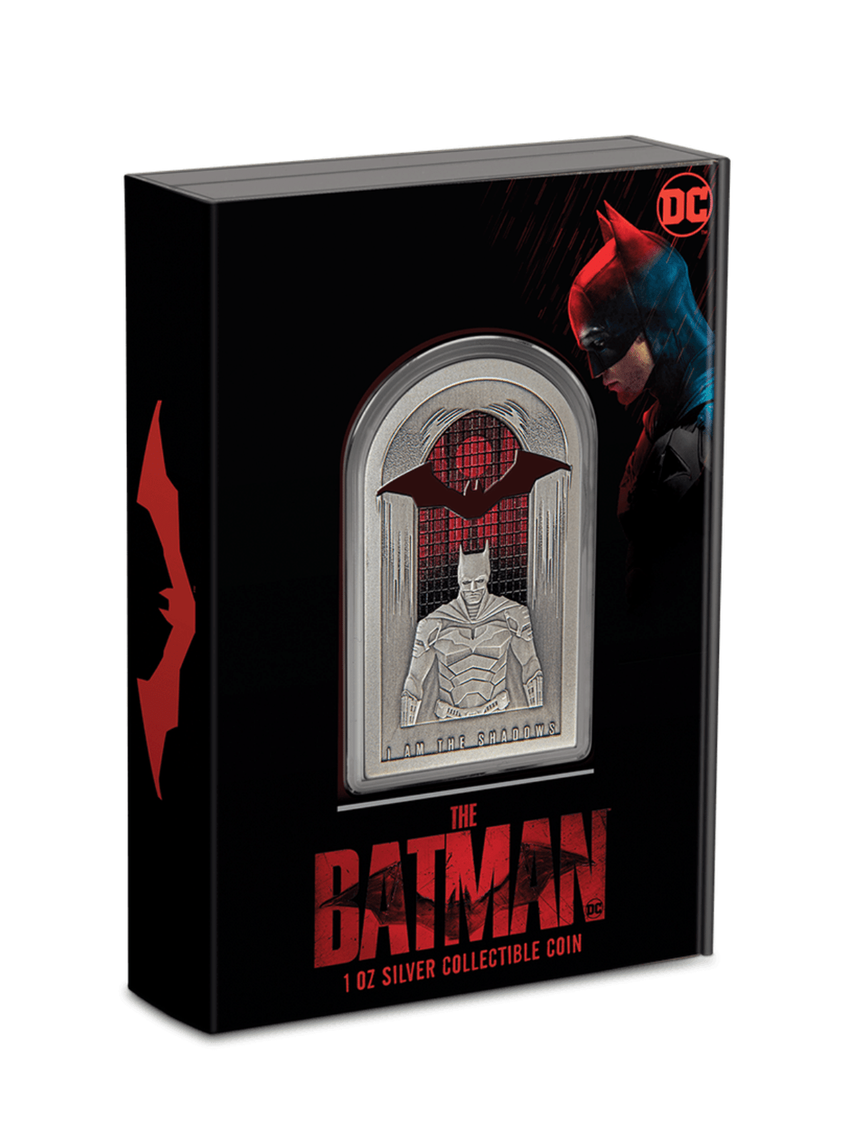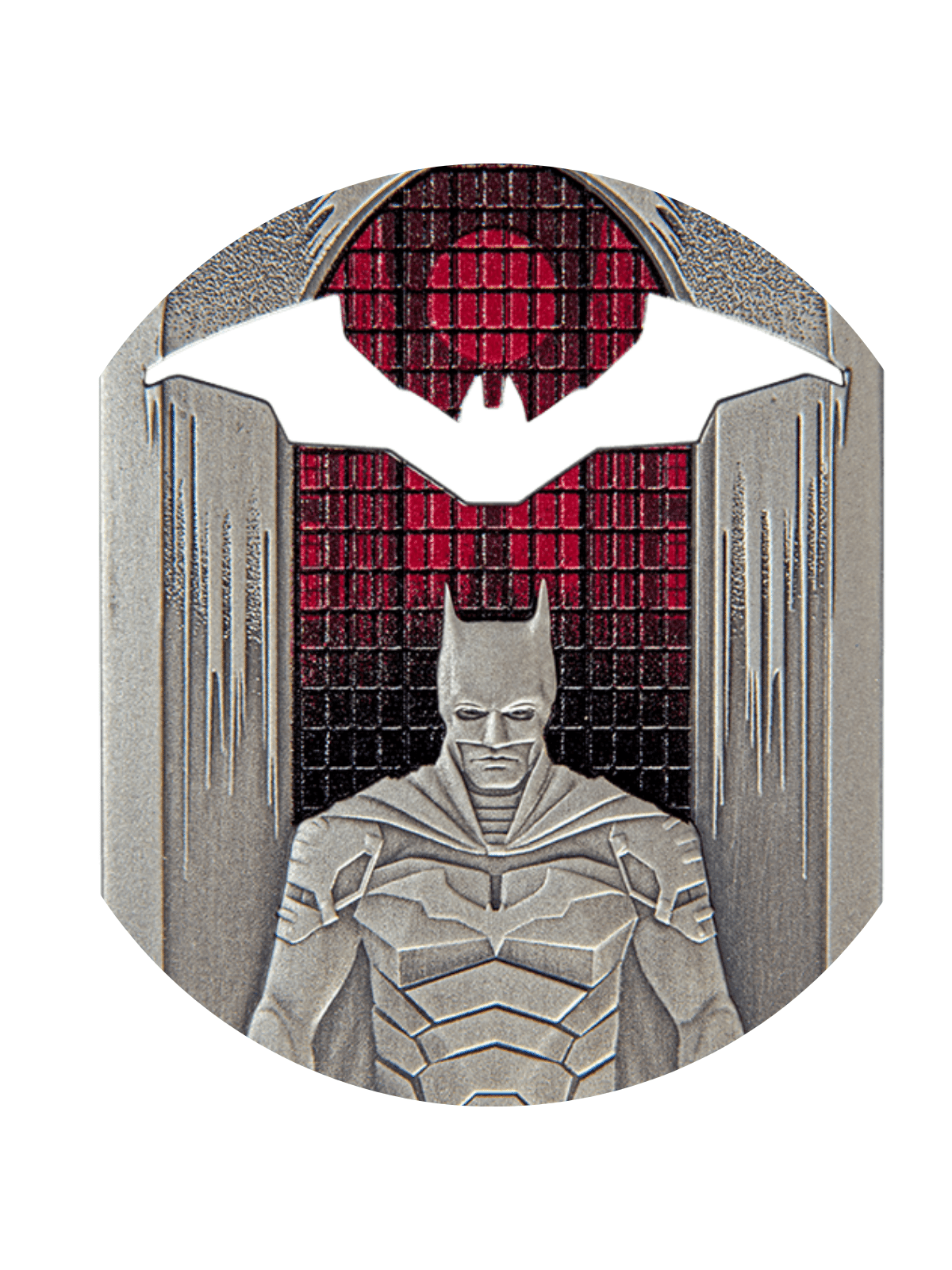 THE BATMAN™ 1 Oz Silver Coin 1 Oz Silver coin is dedicated to new Batman movie staring Robert Pattinson . The coin has a beautiful coloration, an incredible design, an Antique Finish quality and comes in a themed case, along with the Certificate of Authenticity. Limited mintage to 2022 pieces worldwide!