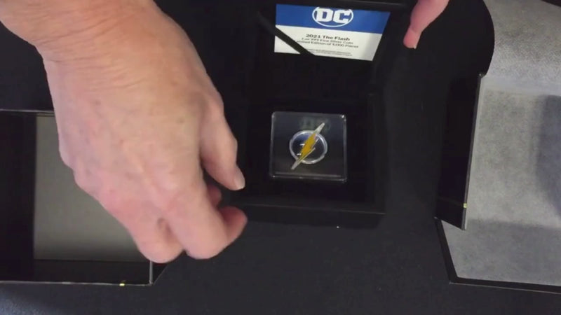 This 1oz pure silver coin celebrates the Scarlet Speedster, THE FLASH™. The coin has been shaped and engraved with a bolt of lightning, the emblem for THE FLASH.