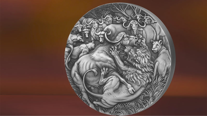 The new ‘The Grand Hunting’ premium coin captures the fierce struggle for survival in the wild, portraying a dramatic savannah battle. The high-relief design showcases every muscle and movement, skillfully rendered in remarkable detail on this luxurious 1-kilo collectible. In the background, a herd of buffalo and predators observe the scene, symbolizing the Circle of Life. Hand polishing enhances depth and clarity, while edge numbering highlights the coin's exclusivity, with only 99 pieces minted. A striking testament to nature's relentless power, beauty, survival, and the raw intensity of the animal kingdom.