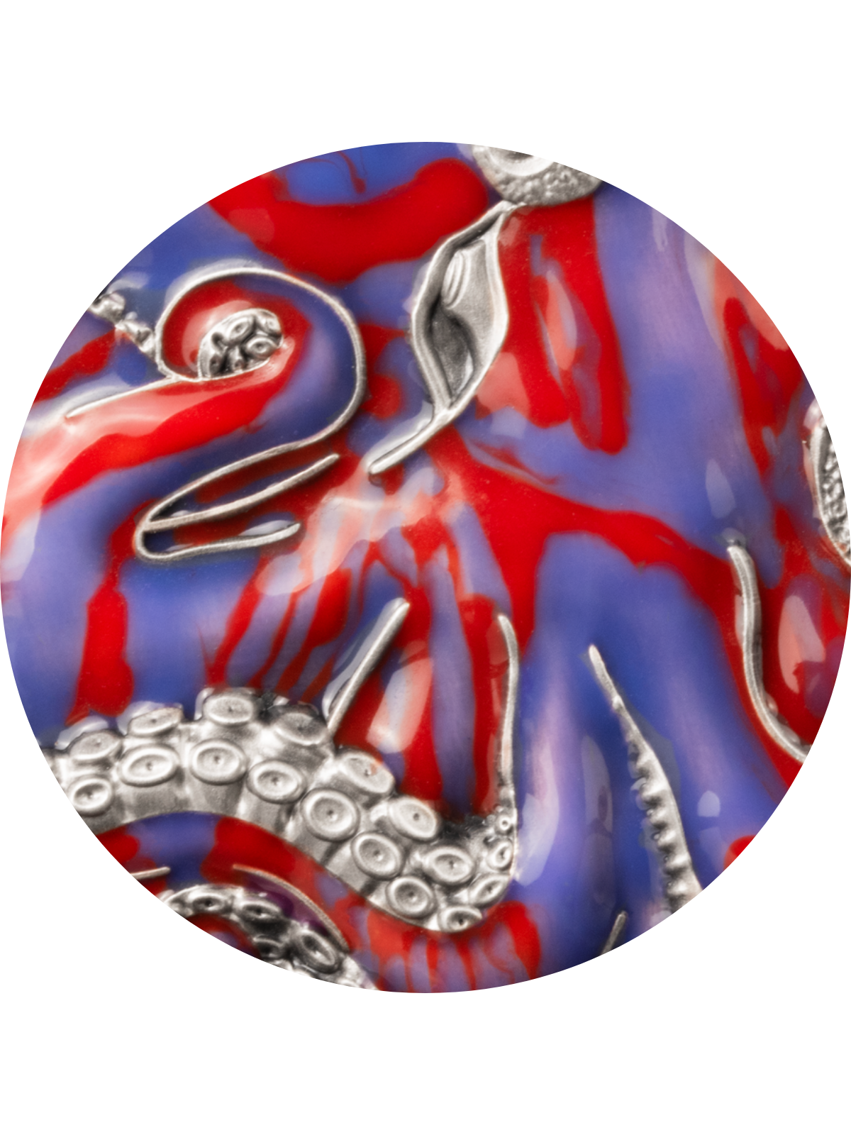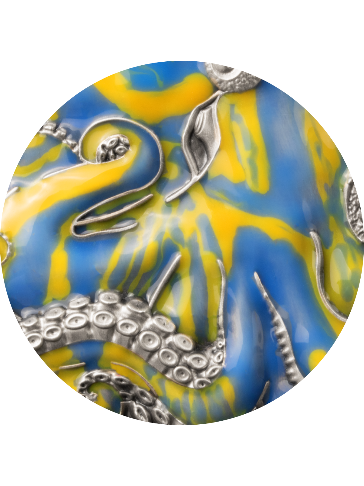 This incredible 3 Oz Silver coin represents a small Octopus that changes colour thanks to the Thermochromic effect, which, depending on its body temperature, makes it totally change. The coin has an Antique Finish quality and comes in a box, along with the Certificate of Authenticity. Limited mintage of only 1,499 pieces worldwide!