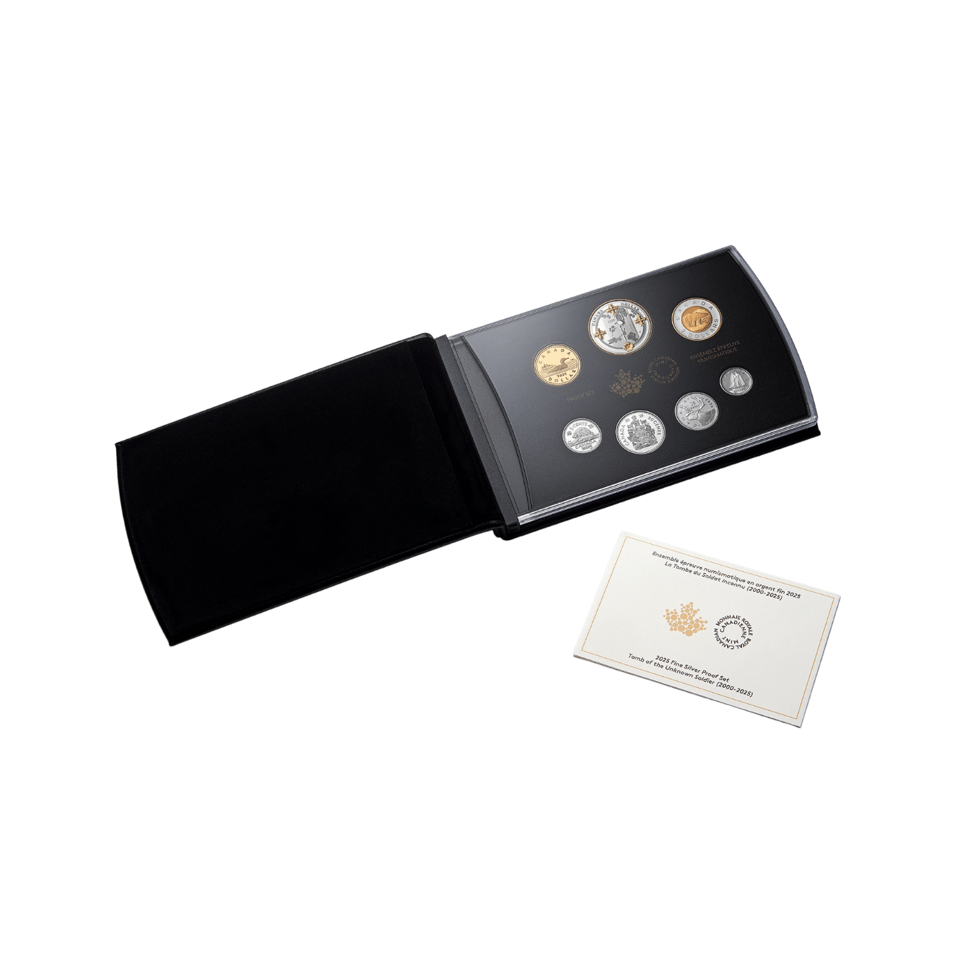 This seven-piece Proof Set contains a selectively gold-plated version of the 2025 Fine Silver Proof Dollar, which marks the 25th anniversary of the completion of the Tomb of the Unknown Soldier at the National War Memorial in Ottawa, Ontario. A set exclusive, the coin’s reverse is enhanced with yellow gold that highlights the Tomb’s four corner pieces, as well as the outer edge that frames this circular interpretation of one of Canada’s most hallowed monuments.