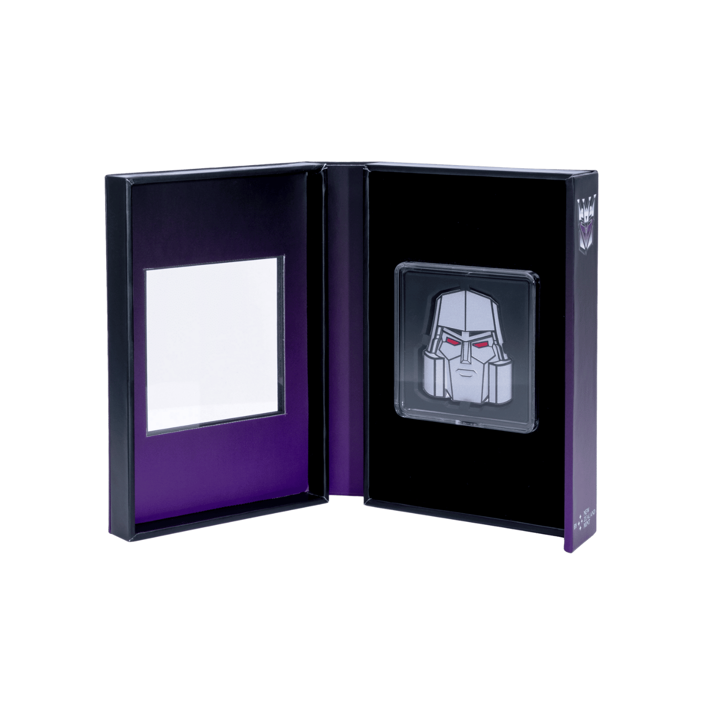 Megatron’s power immortalized in 1oz 999 pure silver. This powerful Decepticon leader stands proudly as the second release in our Transformers Heads collection.