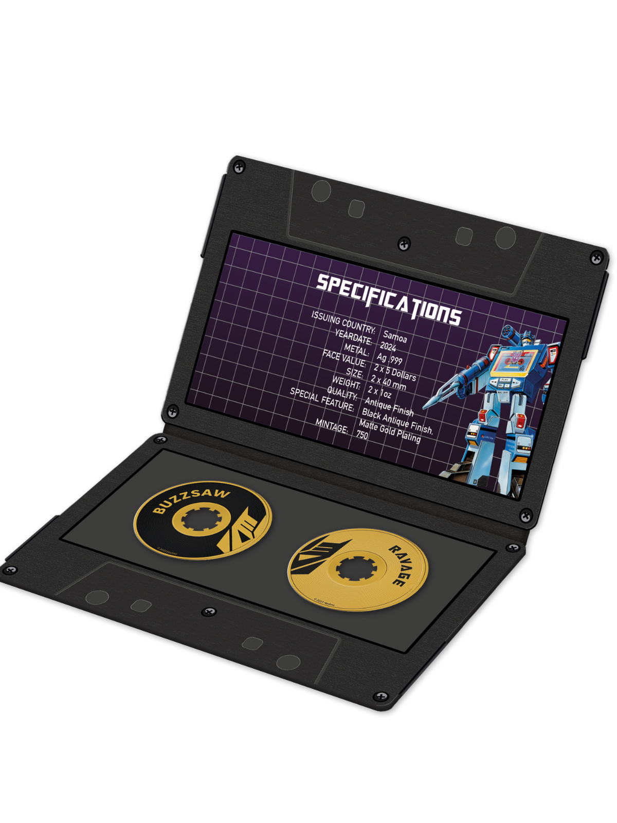 TRANSFORMERS set of 2 Silver coins of 1 Oz each features Buzzsaw and Ravage, the Decepticon cassette warriors of the Transformers universe. The coins are gear wheel shaped with black colour application and matte 24k Gold plating. It is designed to transform into a cassette player depicted by the set's packaging, and comes with the Certificate of Authenticity. Limited mintage of only 750 sets worldwide!