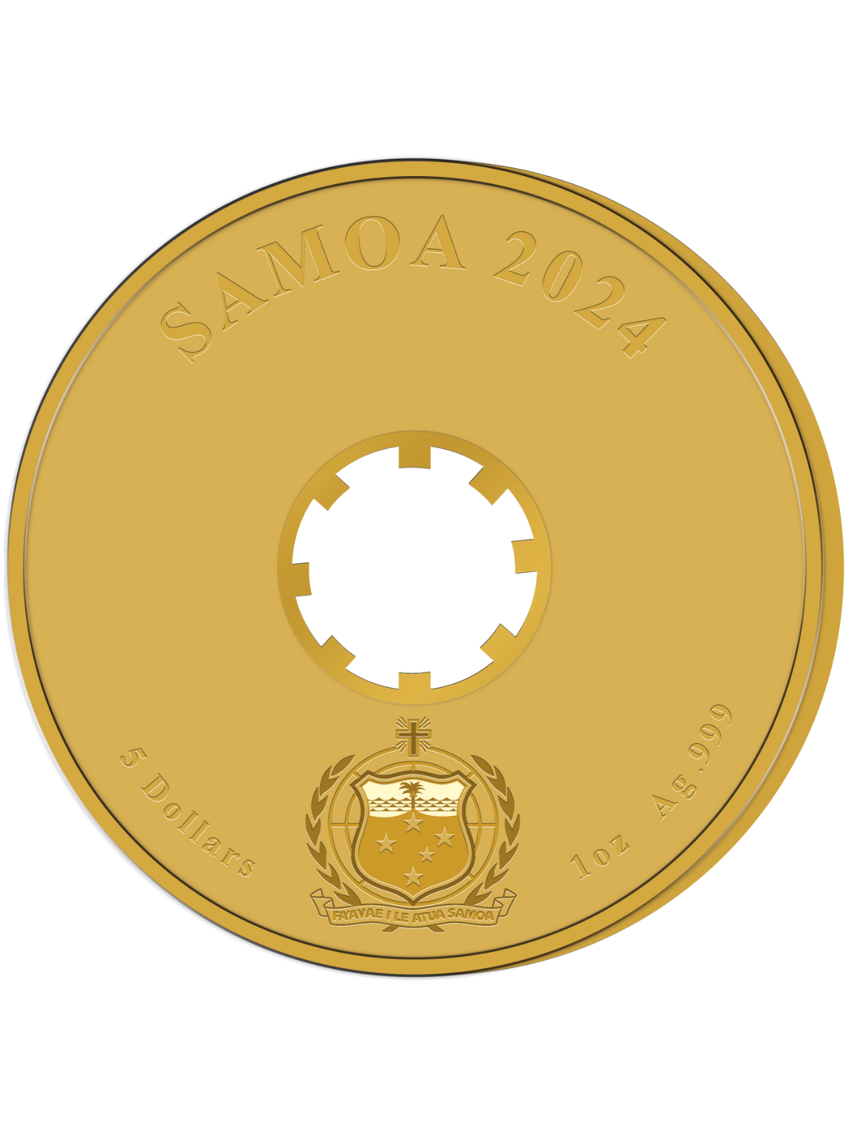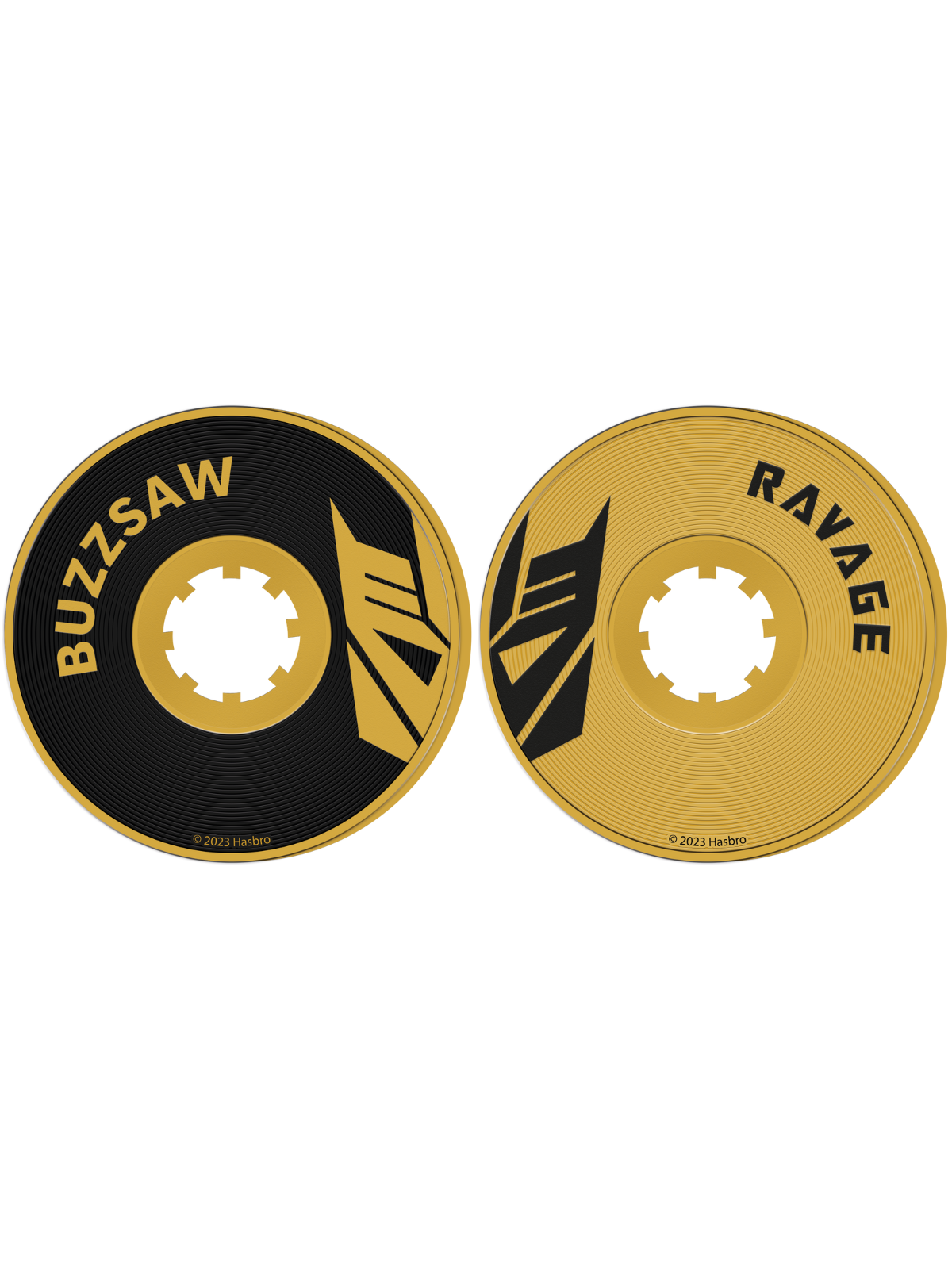 Discover the TRANSFORMERS coin set, featuring Buzzsaw and Ravage. These 1 Oz proof-like coins boast a unique gear wheel shape, black color application, and matte 24K Gold plating.