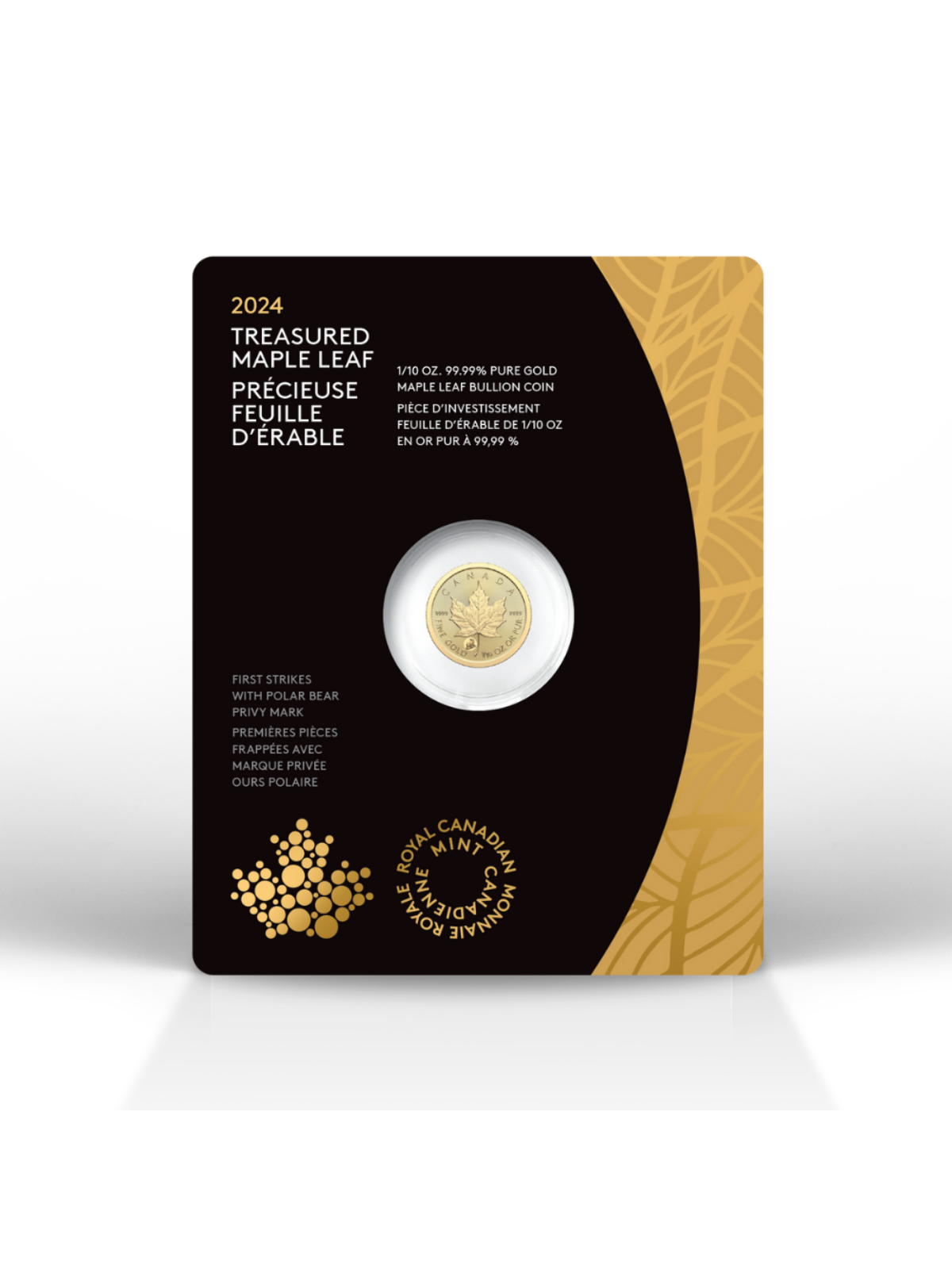 Celebrate life's milestones with the Treasured Gold Maple Leaf First Strikes featuring a special Polar Bear Privy Mark. Issued directly by the Royal Canadian Mint, this Premium Bullion offering showcases the first gold bullion strikes with the new effigy of His Majesty King Charles III, making it a precious and pure gift. The coin bears a unique polar bear privy mark, signifying the moment it was struck on the first days of production. With strict quality controls and consistent weight, First Strikes are highly coveted, and this edition is available one month early, adding to its exclusivity. Specially handled throughout manufacturing, each coin is encapsulated in stylish packaging, featuring a redesigned card with a QR code for easy access to bullion information. The limited mintage of 5,000 worldwide ensures its rarity, and it is also available in silver with different themed privy marks, providing options for various celebrations. Each Treasured Gold Maple Leaf is encapsulated and presented in re-designed card packaging, enhancing its appeal and making it a unique addition to any collection.