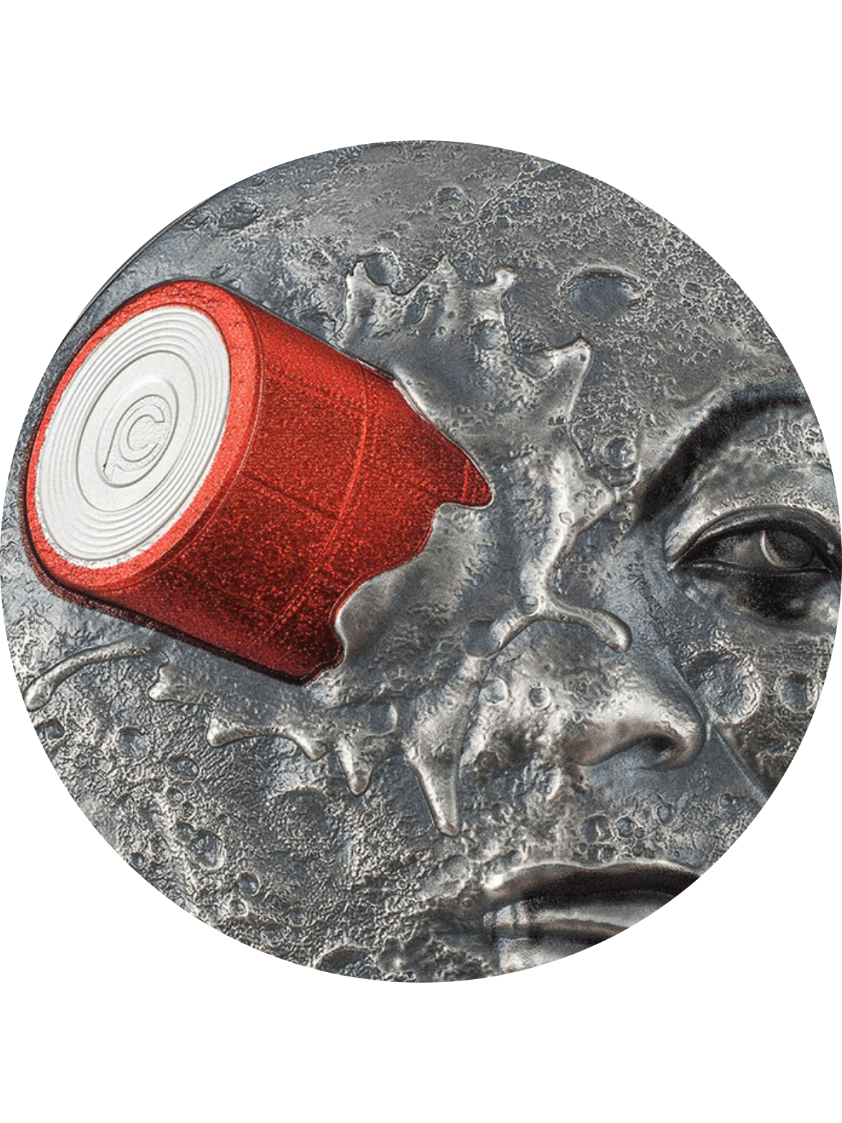 TRIP TO THE MOON 2 Oz Silver Coin celebrates the 120th Anniversary of the first sci-fi movie “A trip to the Moon” by Georges Méliès. The coin has Smartminting Ultra High Relief, has Antique Finish quality and a partial brilliant red coloration, features a unique design and comes in a case, along with the Certificate of Authenticity. Limited mintage of 500 pieces worldwide!