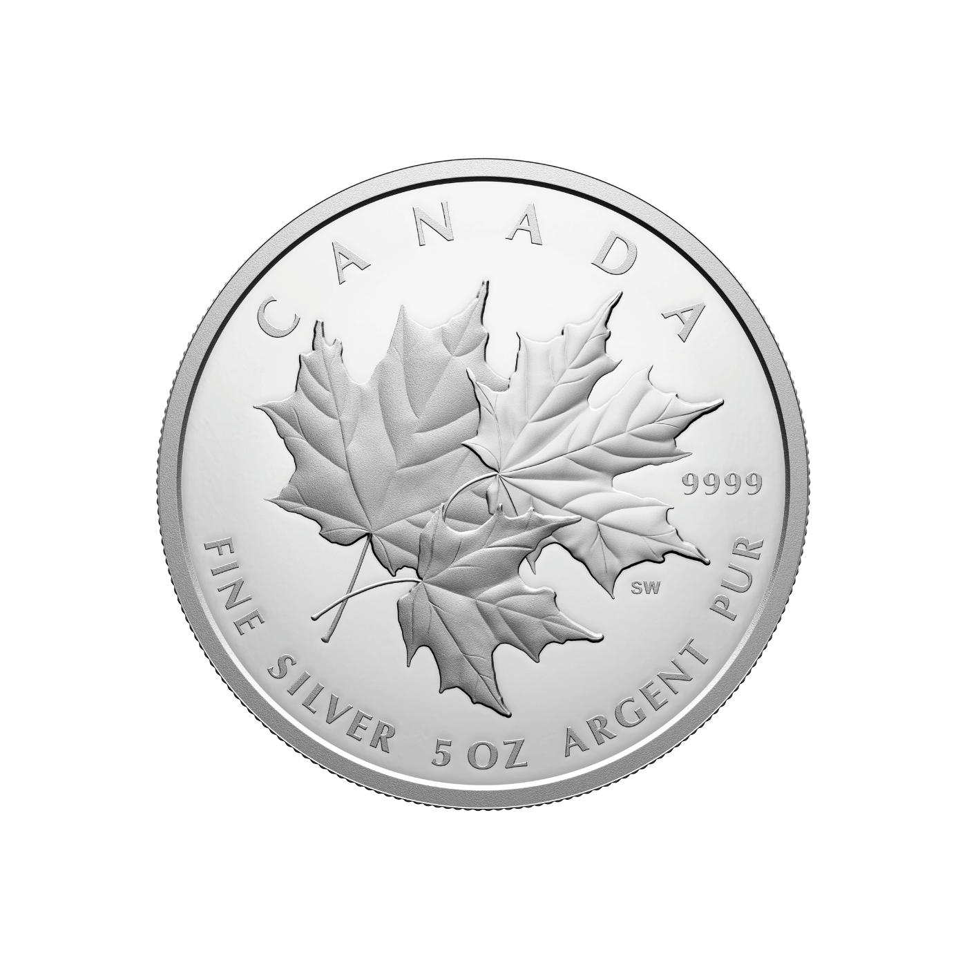 - Available in silver and gold. Your coin is magnificently crafted in 5 oz. of 99.99% pure silver with a large diameter (65.25 mm) that makes it the largest-sized Triple Maple, which is also available in 1 oz. fine silver and 1 oz. pure gold.