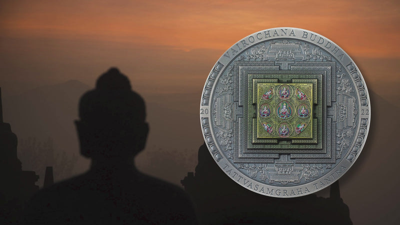 VAIROCHANA BUDDHA MANDALA 3 Oz Silver coin is the 9th release in the “Archeology & Symbolism” series. In this edition: Vairochana Buddha Mandala. The coin features Smartminting© technology, has Antique Finish quality, is partially colored and comes in a beautiful case, along with the Certificate of Authenticity. Limited mintage of only 111 pieces worldwide!