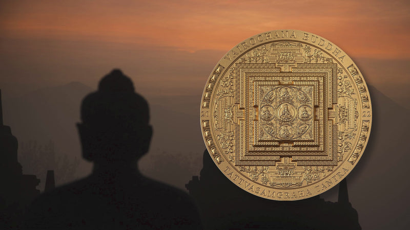 VAIROCHANA BUDDHA MANDALA s 3 Oz Silver coin is the 9th release in the “Archeology & Symbolism” series. In this edition: Vairochana Buddha Mandala. The coin features Smartminting© technology, has Silk Finish, is Gold plated and comes in a beautiful case, along with the Certificate of Authenticity. Limited mintage of only 111 pieces worldwide!