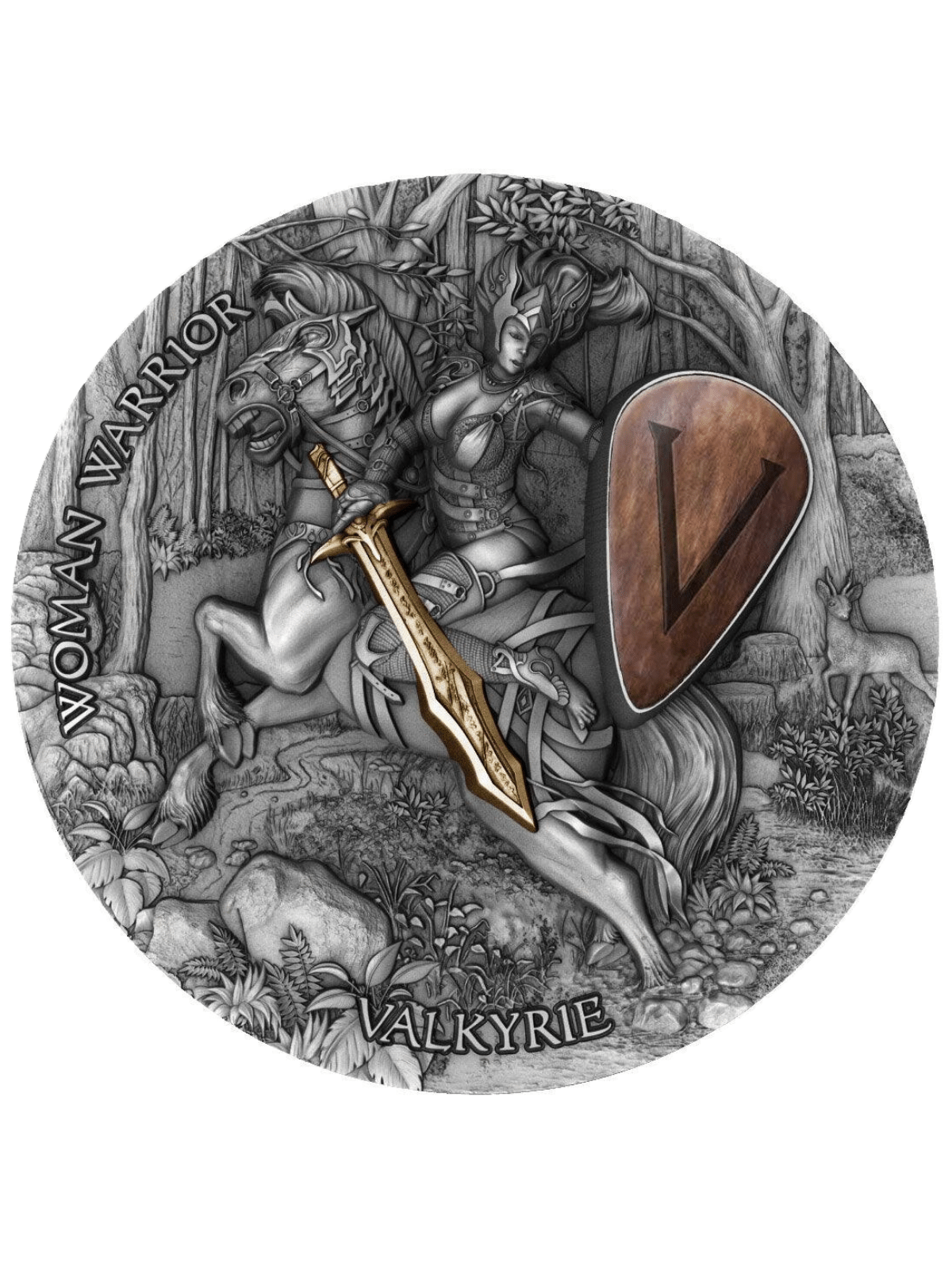 VALKYRIE Woman Warrior 2 Oz Silver coin is the second issue in the “Woman Warrior” series and depicts a wonderful Valkyrie holding her sword. The coin has an incredible High Relief, has a selective Gold plating and a Wooden insert, has an Antique Finish quality and comes in a wooden case, along with the Certificate of Authenticity. Limited mintage to only 555 pieces worldwide!