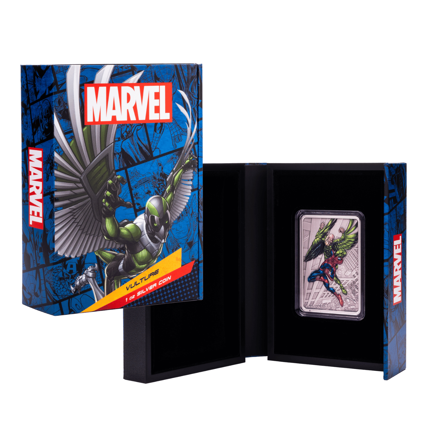 - Battle in the Skies: The coin highlights a colored graphic of Spider-Man & Vulture as they battle between the towering skyscrapers of New York City.