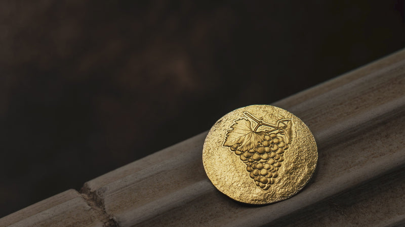 WINE GRAPES Naxos Ancient Greece Gold Coin is dedicated to Wine Grapes, in particular, the variety of grapes coming from Naxos, an island in Greece that is known for producing wine. The coin in Silk Finish has a very interesting design with a remarkable Greek style and it comes in a capsule. Limited mintage of 15,000 pieces worldwide.