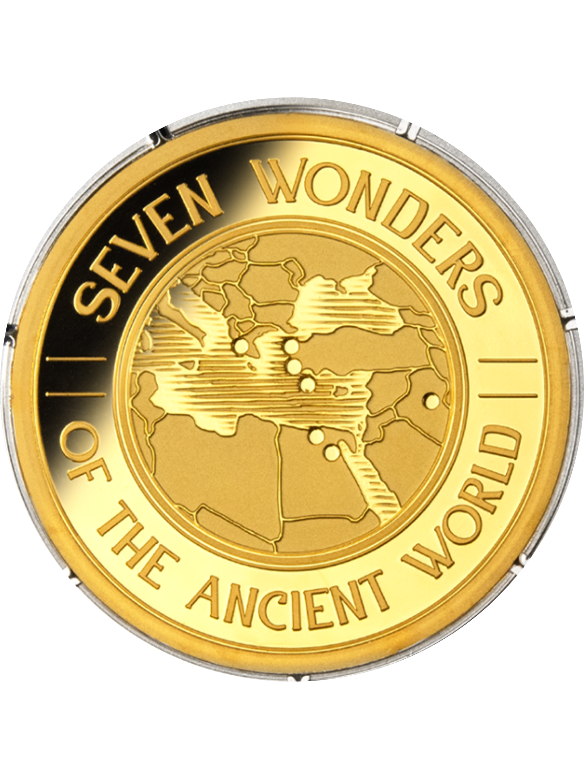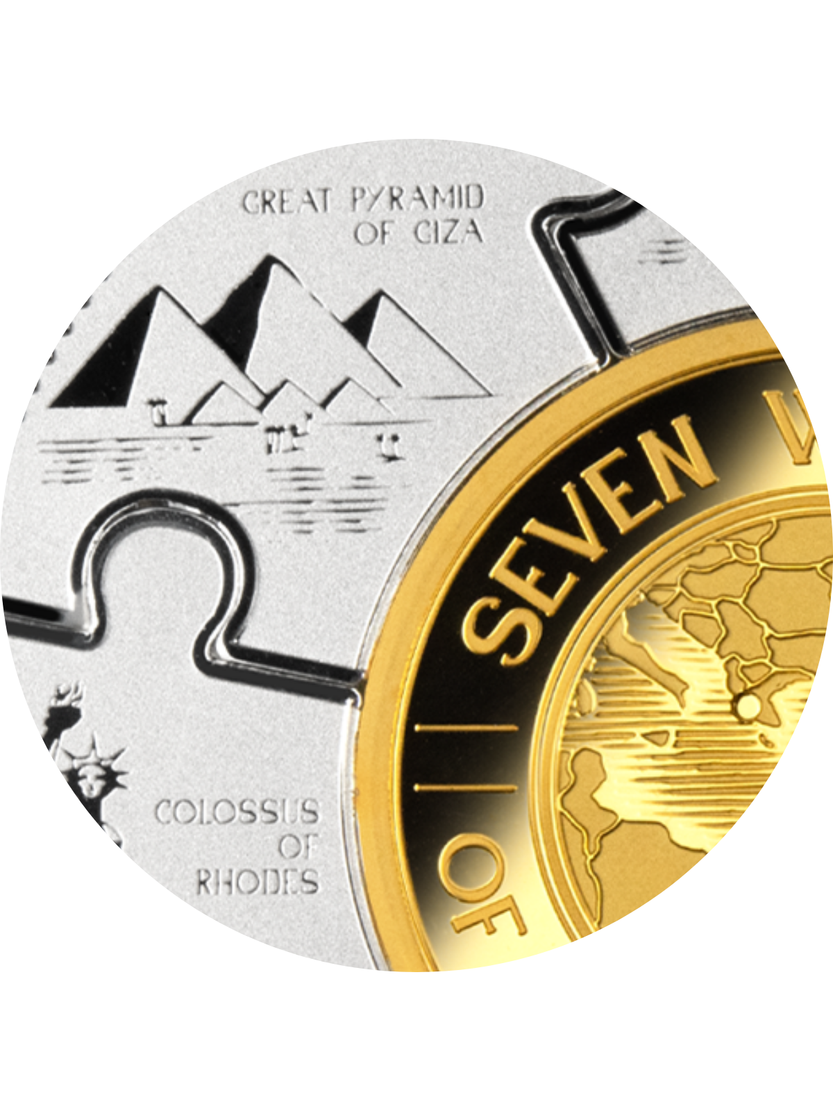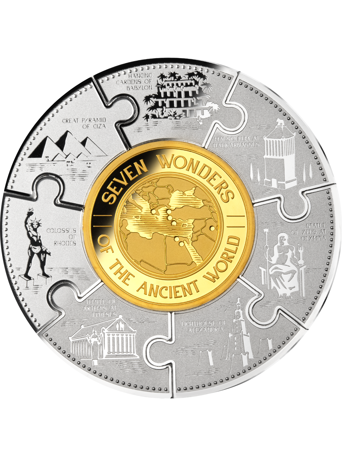 WONDERS OF THE WORLD 5 oz Silver Coin is a puzzle coin with 8 pieces in total. The 7 pieces represents 7 wonders of the world, Great pyramid of Giza, hanging gardens of Babylon, Statue of Zeus at Olympia, Temple of Artemis at Ephesus, Mausoleum at Halicarnassus, Colossus of Rhodes, and Lighthouse of Alexandria. The coin has proof-like quality and comes in a box, along with the Certificate of Authenticity. Limited mintage of only 250 pieces worldwide!