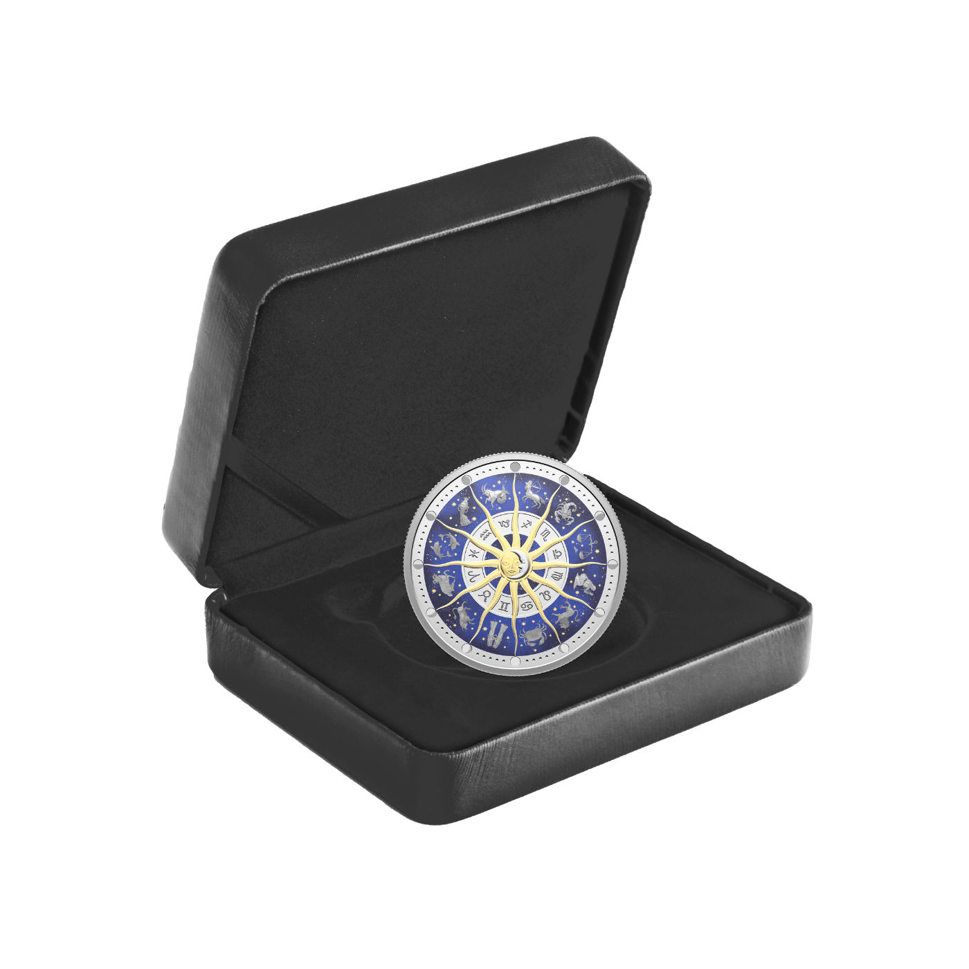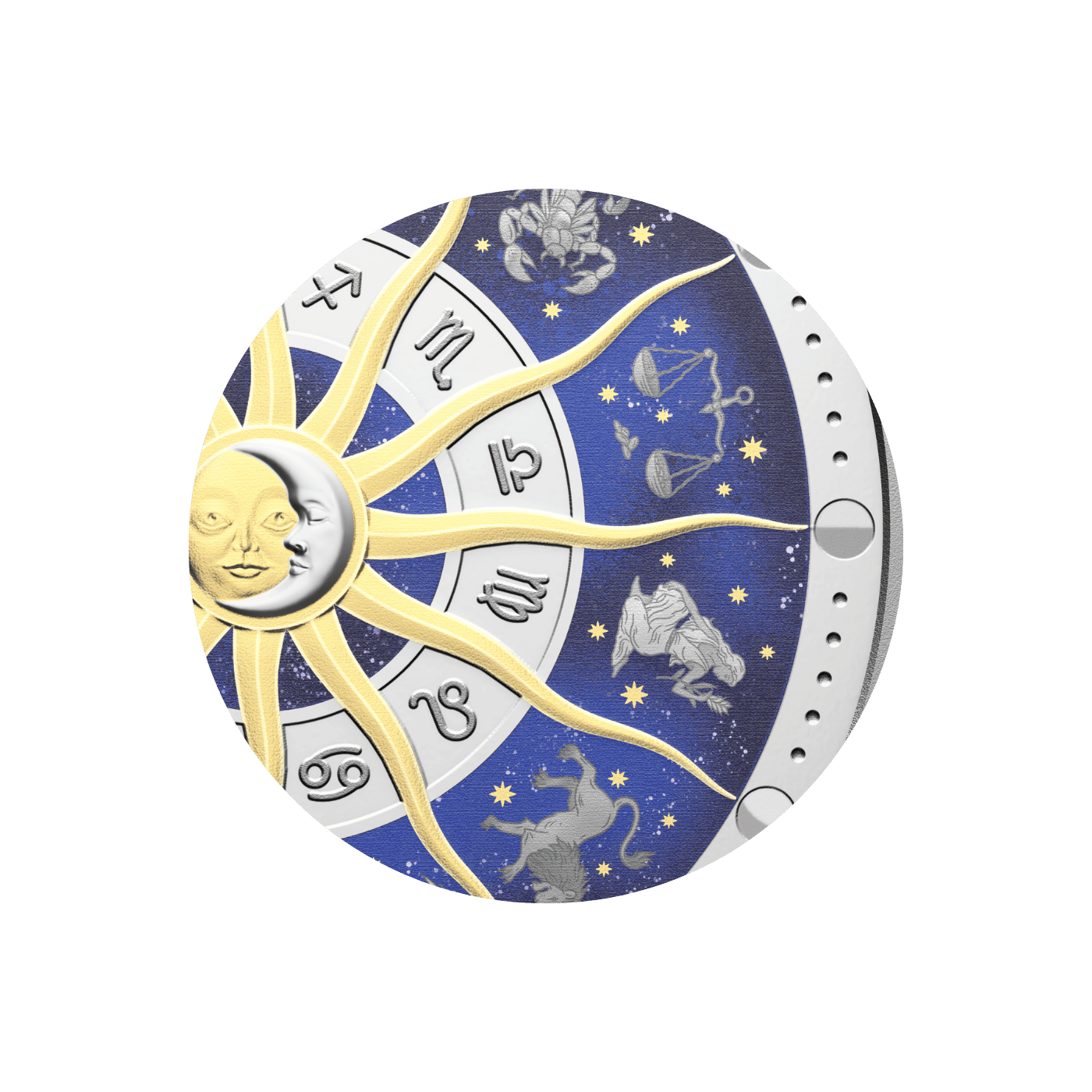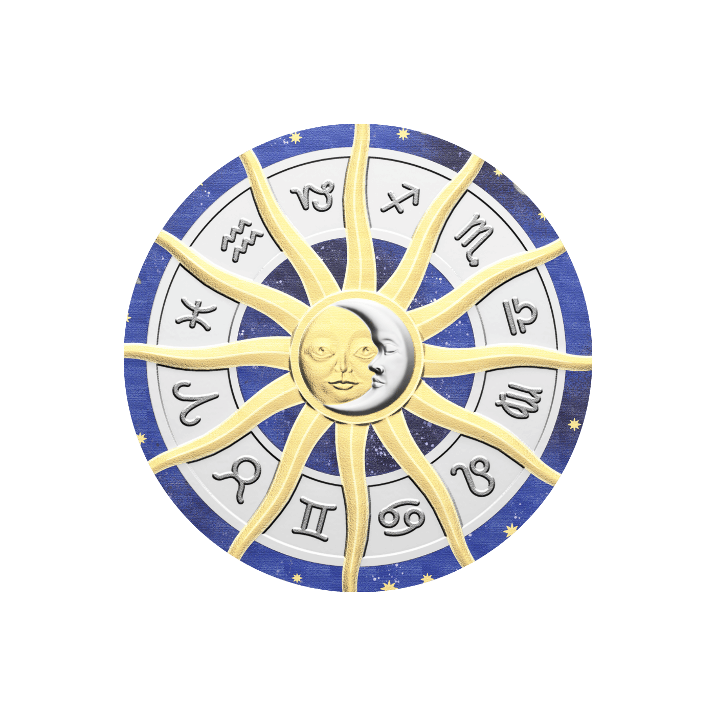 From Aries to Pisces, each piece of the zodiac puzzle represents our connection to the cosmos, where planetary interactions may influence our own relationships and personalities. The 12 astrological signs are elegantly represented on this 99.99% pure silver zodiac coin, which is imbued with the energies of the sun and moon. Its colour-over-engraved design features a dazzling blue night sky and painted metallic gold accents that reflect our collective captivation with cosmic arrangements, and all the different meanings attributed to them.